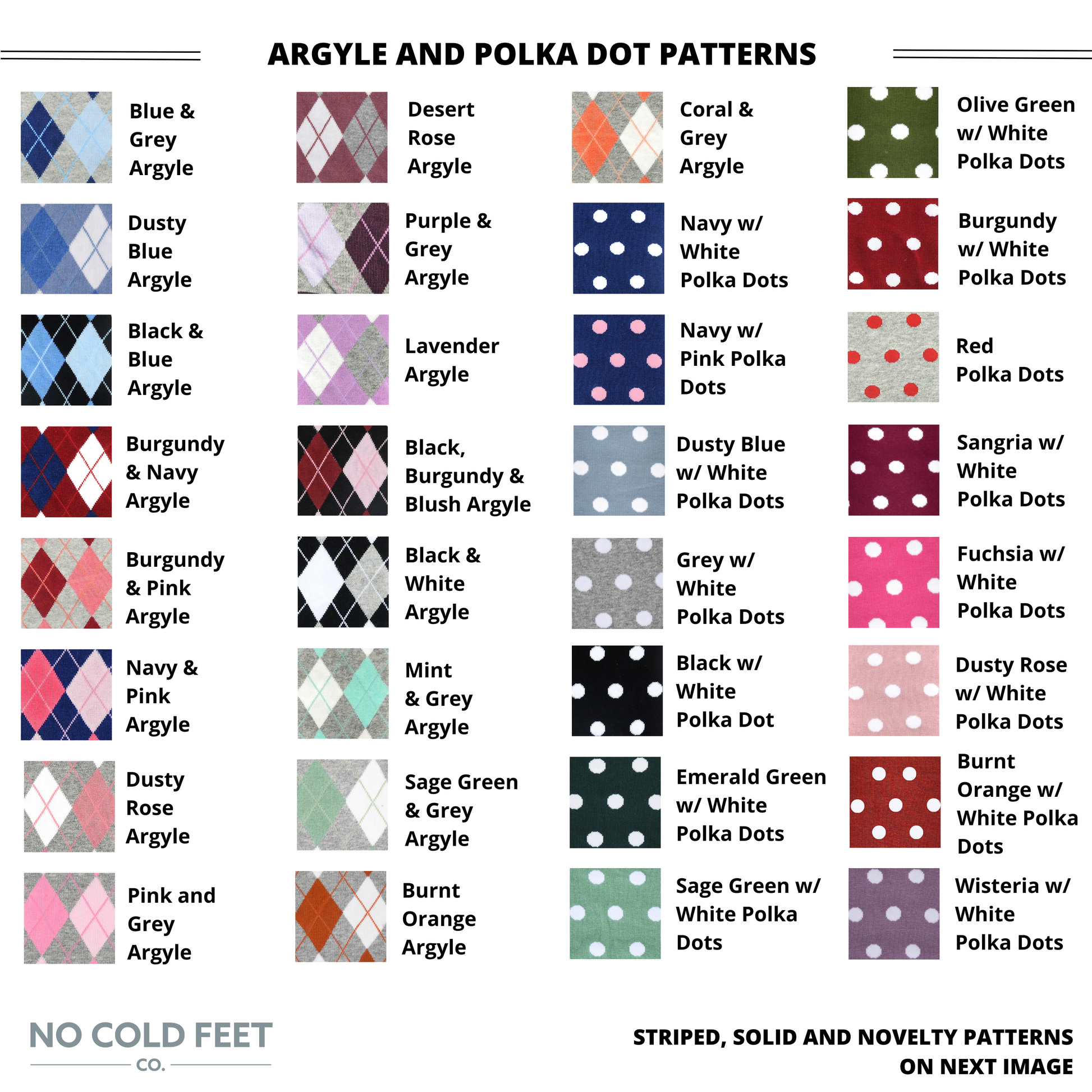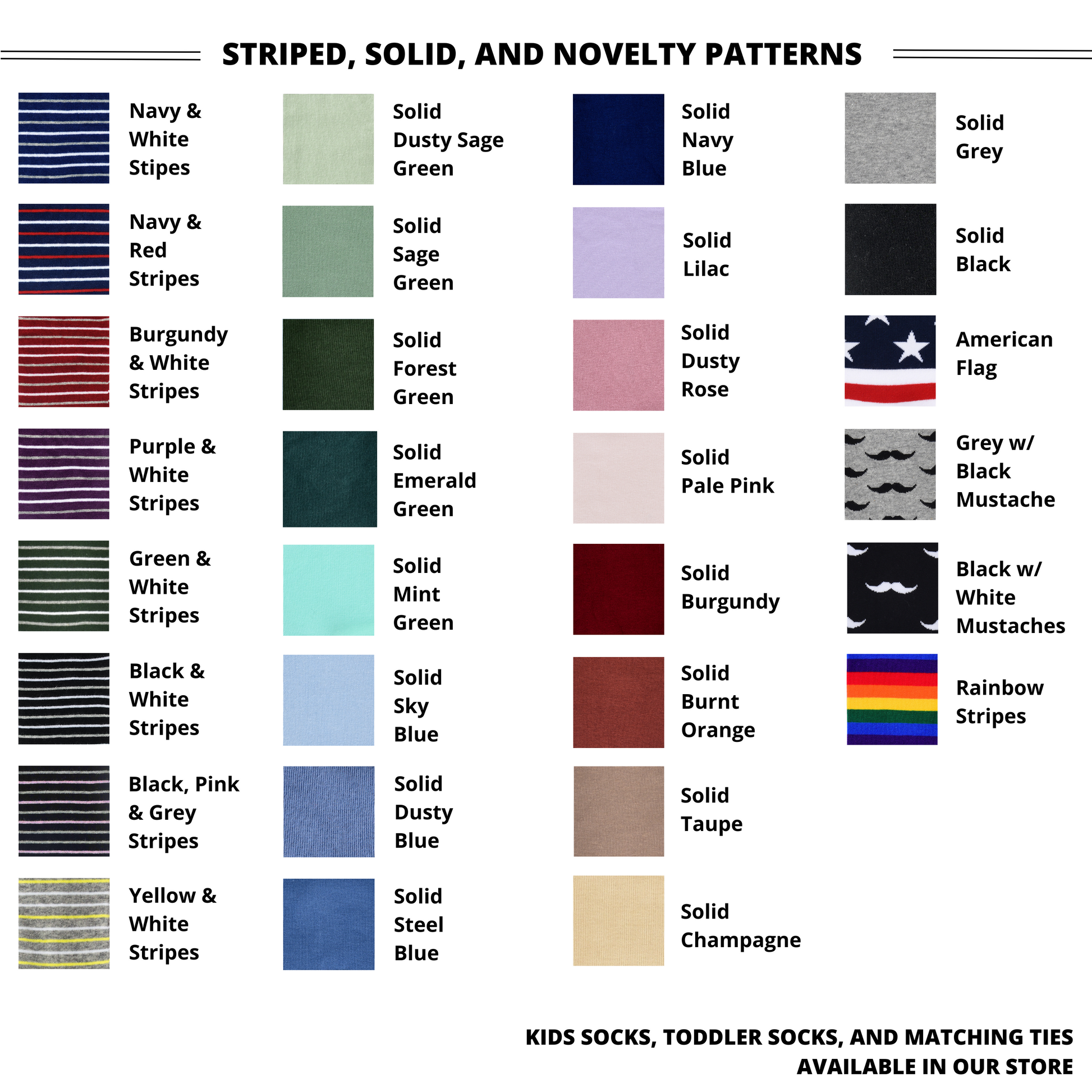 All of our socks are mid-calf crew socks and many styles/colors come in three different adult sizes.